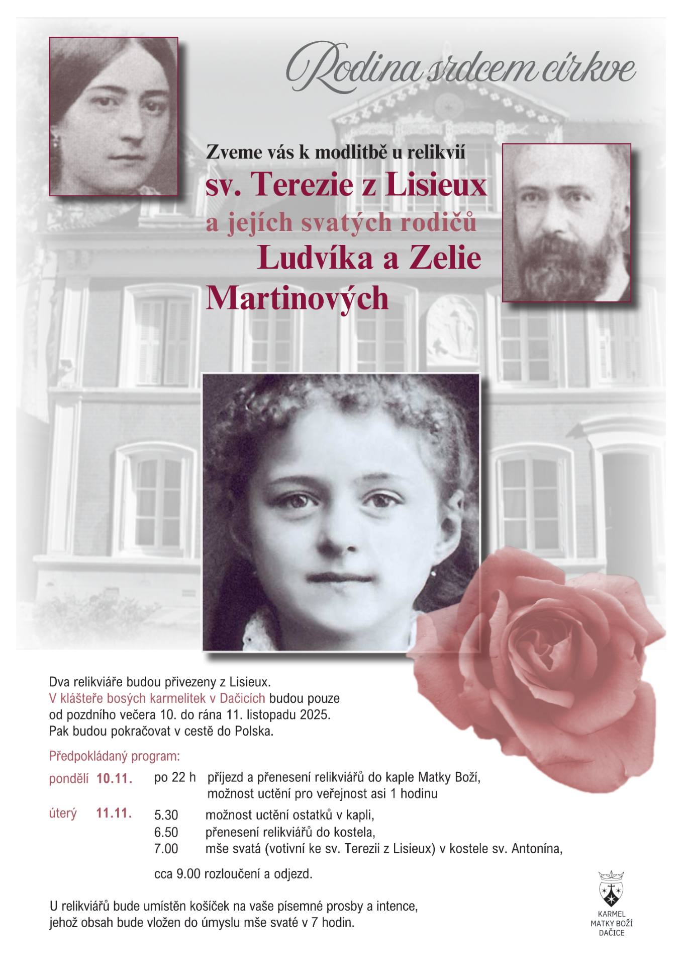 Komunita bosých karmelitek srdečně zve k modlitbě u relikvií sv. Terezie z Lisieux a jejich svatých rodičů Ludvíka a Zelie Martinových.